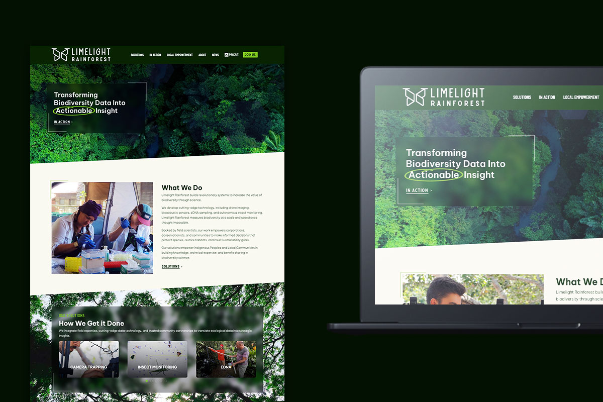 Limelight Rainforest is a unique and interesting organization. Doing canopy mapping of the Amazon Rainforest, insect monitoring, and acoustic recordings Limelight is truly a one of a kind organization. After winning the grand prize in the X Prize competition they approached us to elevate their look and better communicate what they do.