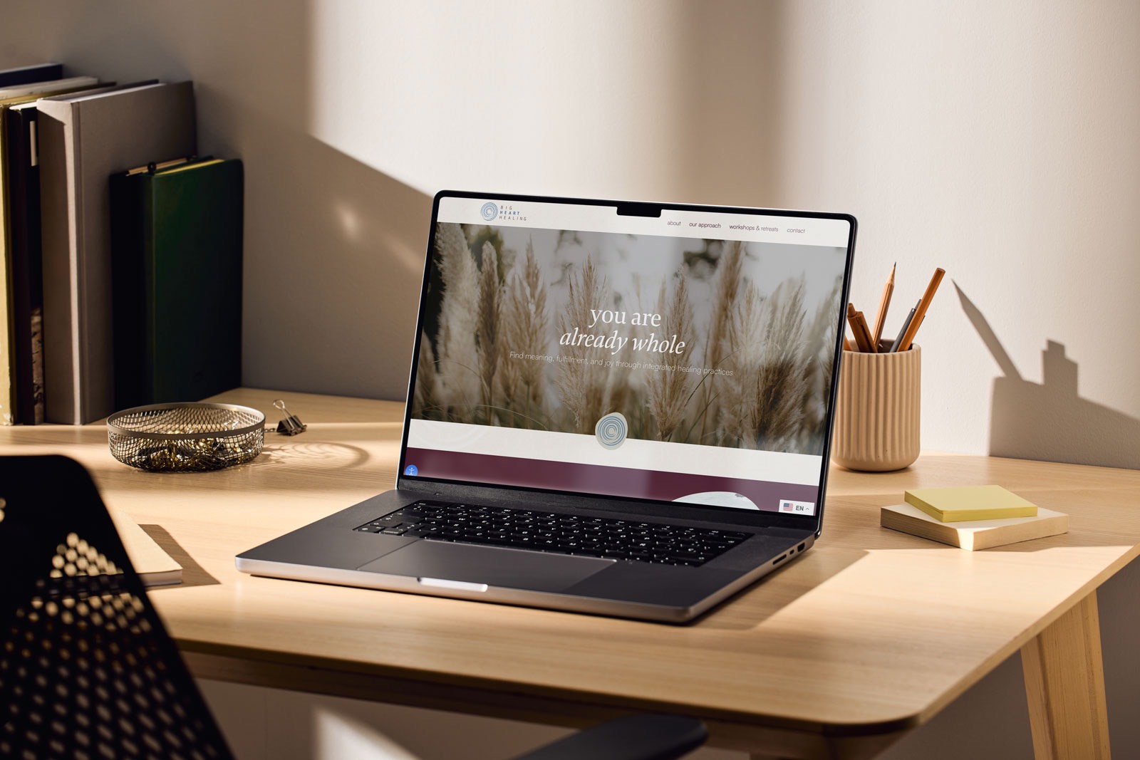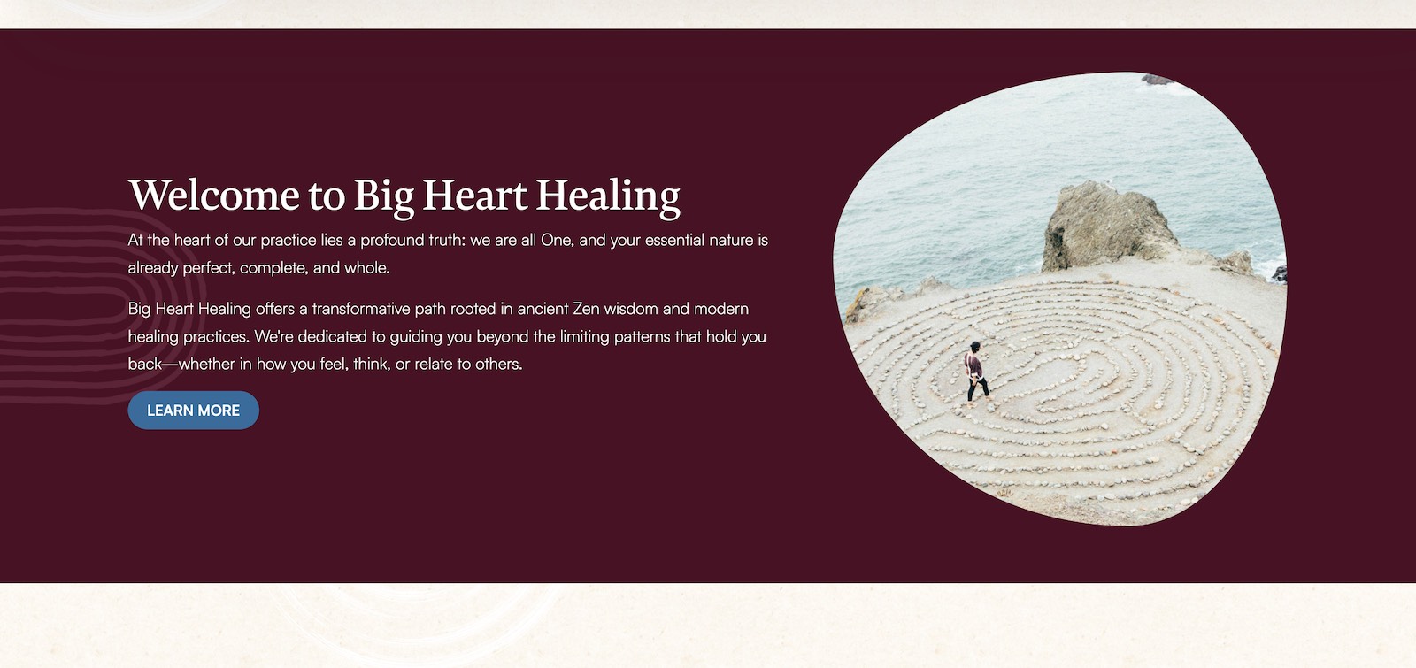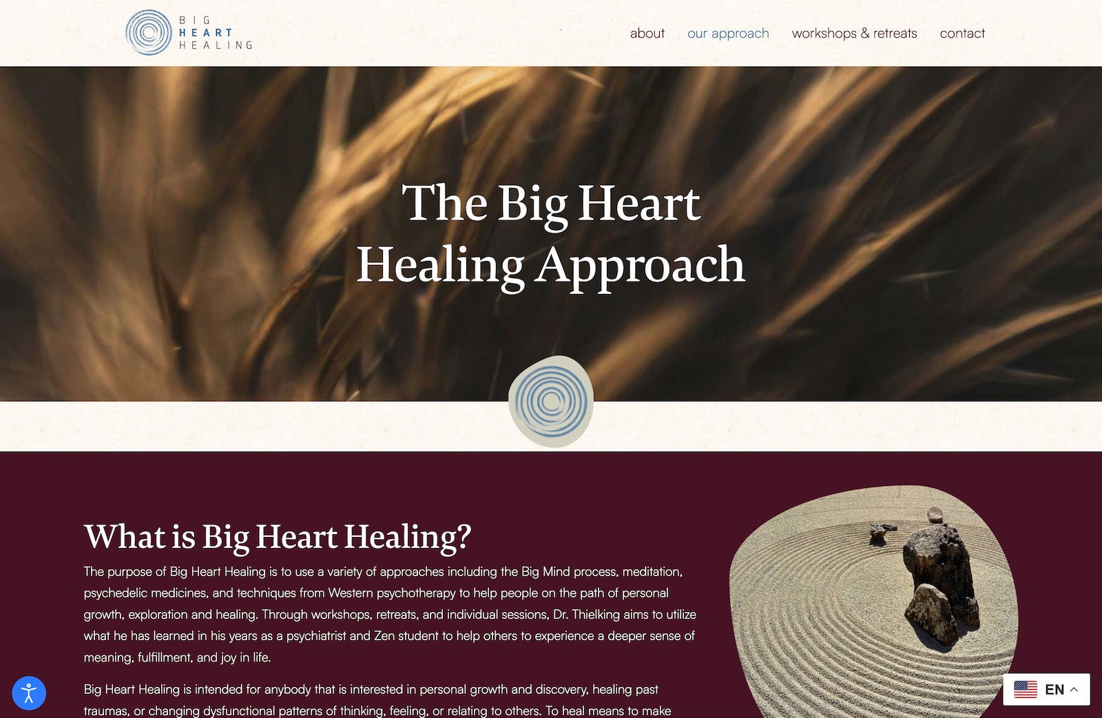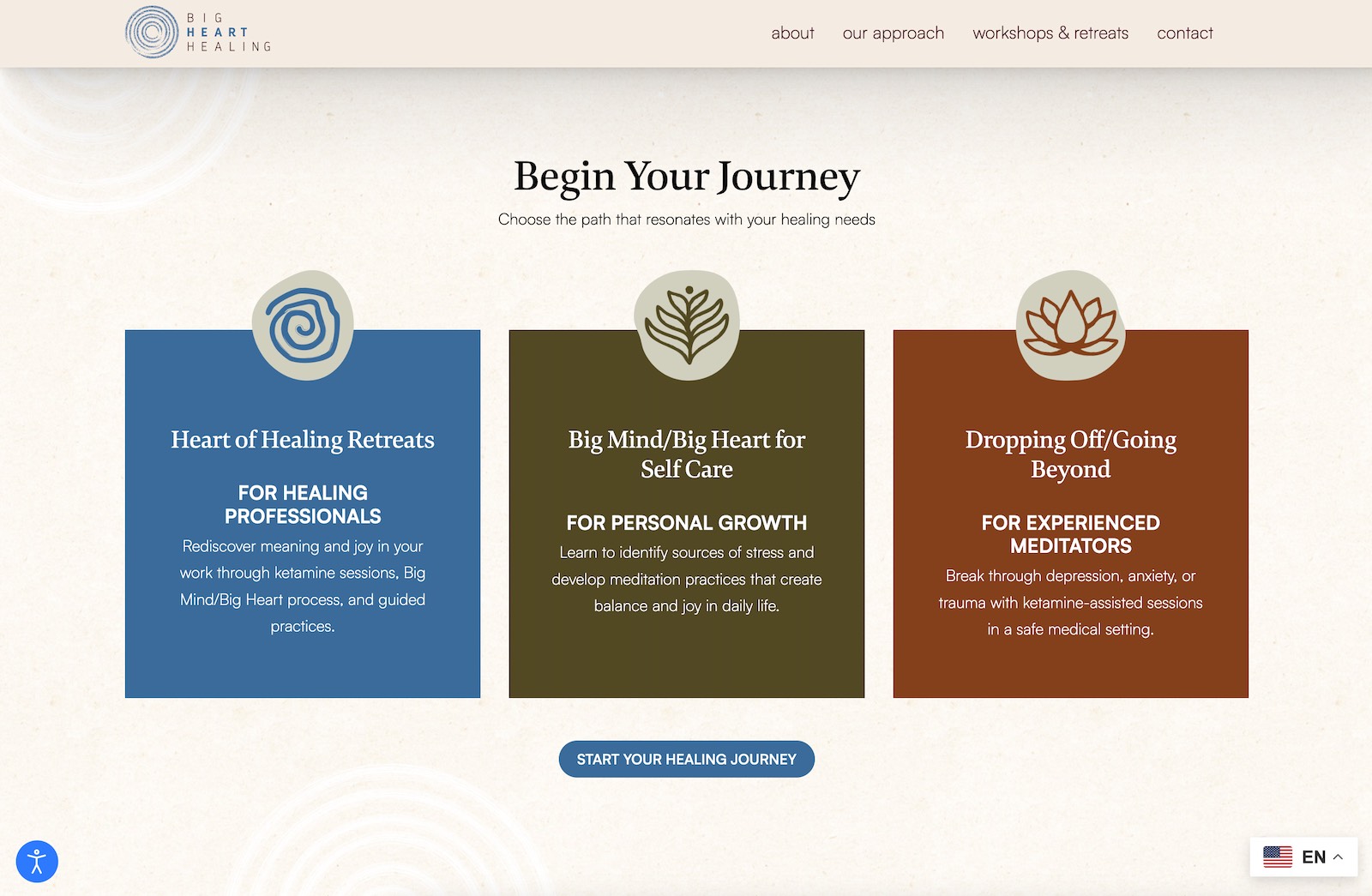 In this latest iteration, we warmed up the brand with a richer, more inviting color palette and subtle shifts in typography and layout, all while preserving the feeling of spaciousness and ease. The site now more clearly highlights Big Heart Healing’s integrated approach, rooted in ancient Zen wisdom and modern healing practices, and guides visitors into clear pathways to sign up for workshops and Zoom events. Messaging on the homepage centers the idea that “you are already whole,” and the design supports that with gentle, reassuring visuals and plenty of breathing room.